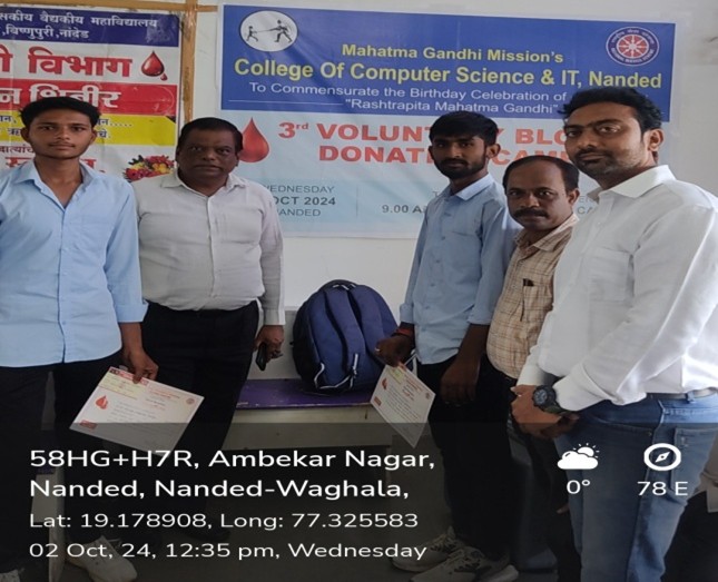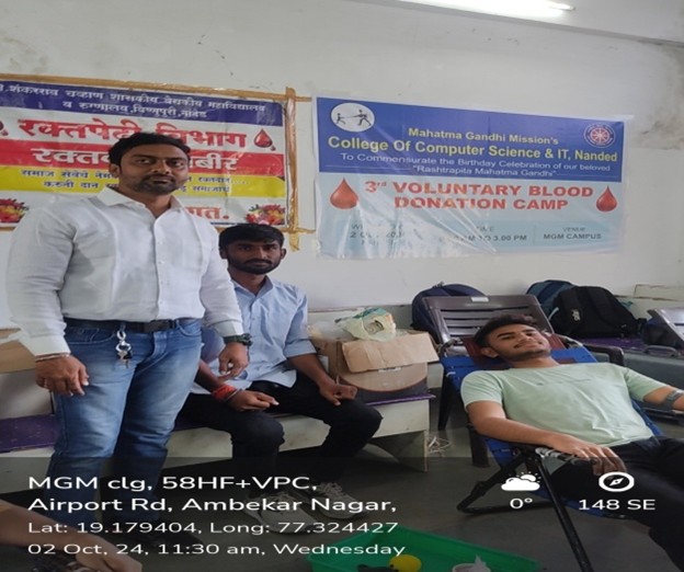 The National Service Scheme (NSS) Unit of college organized a Blood Donation Camp on 2/10/2024 every year in collaboration with Indian Red Cross Society Blood Bank & MGM’s Medical college , Ch. Sambhajinagar. The camp aimed to promote the spirit of voluntary service and create awareness about the importance of blood donation.